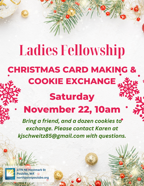 Get ready for one of our favorite traditions—the Ladies Fellowship 4th Annual Card-Making & Cookie Exchange. It’s always a blast—crafting beautiful cards, sharing laughter, and swapping sweet treats! Bring a friend and a dozen of your favorite cookies to exchange. Don’t miss out on the fun—mark your calendar now!