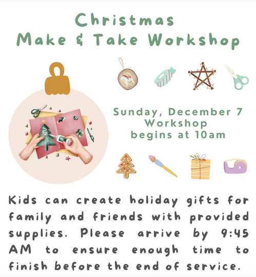 All are welcome! We encourage kids to bring a friend for this fun annual tradition. Kids can create holiday gifts for family and friends with supplies that our Sunday School program will provide. Please arrive by 9:45am to allow enough time to finish before the end of the 10:30am service.